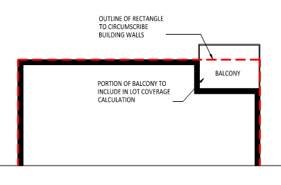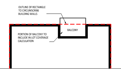 Although I have not found a ZRD1 that addresses this issue, I believe the zoning text requires us to include as lot coverage any portion of the balcony that falls within the largest rectangle which circumscribes the building, as shown below:
